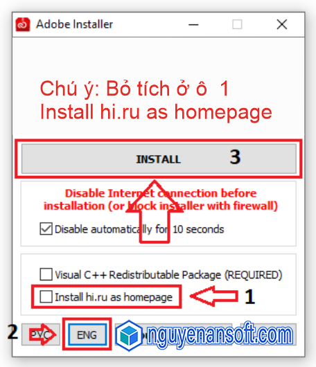 - Bước 3: Bước này rất quan trọng nha. Để có kinh phí hoạt động tác giả của bản cr2ck này đã thêm một option trong phần cài đặt như bên dưới là “advertising: install…”. Thường là nó sẽ mong muốn mình cài trình duyệt đó là hi .ru, đây không phải là virus, nhưng nó gây rất nhiều phiền toái.