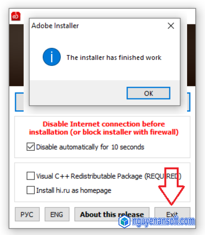 - Bước 5: Sau khi cài đặt thành công, giao diện cài đặt kết thúc hiện ra như bên dưới. Bạn hãy click vào OK và chọn Exit để thoát và hoàn tất quá trình cài đặt.