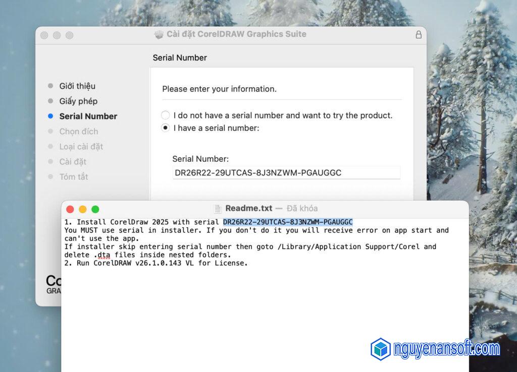 B2. Tải đúng phiên bản (Tùy máy Chip M (M là M1, M2 , M3),.. – (Intel) Chạy file CorelDraw Graphics Suite để cài như bình thường. Trong lúc cài có hỏi Key thì điền key sau: