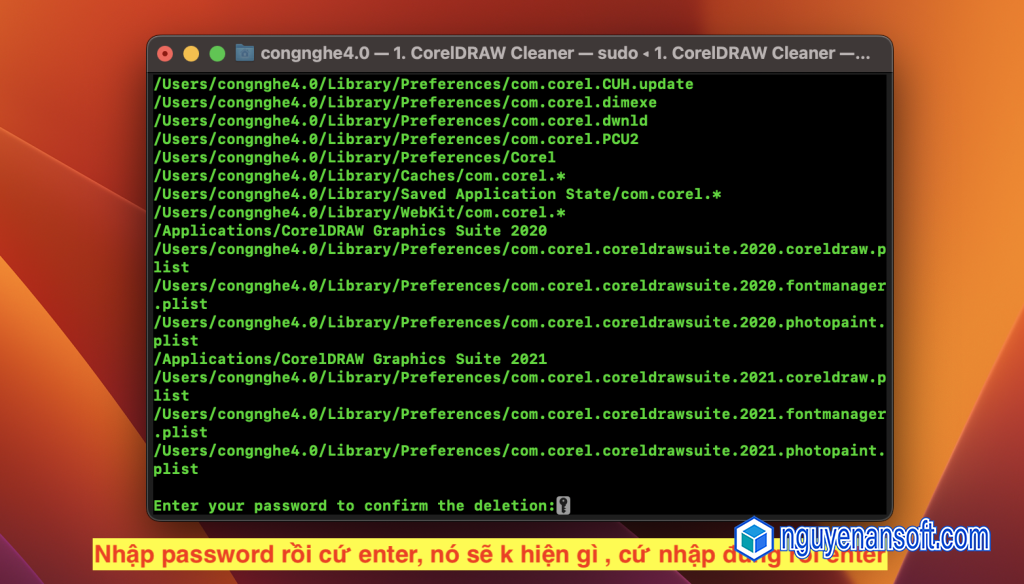 Chặn kết nối bằng Terminal chạy đống lệnh này từng dòng nha. Cứ coppy từng dòng rồi Enter – hiện ra password thì cứ ấn đúng pass rồi enter – rồi mở terminal ấn lại từng cái – để chặn kết nối tới Corel sẽ ko bị detect lic trở lại.